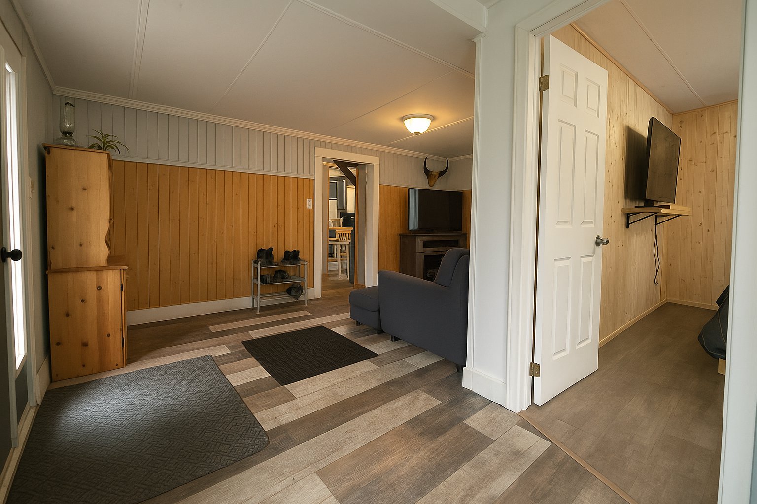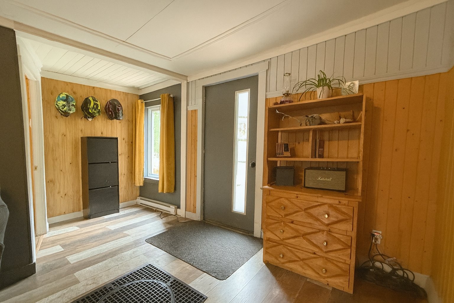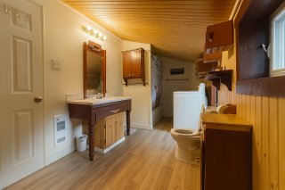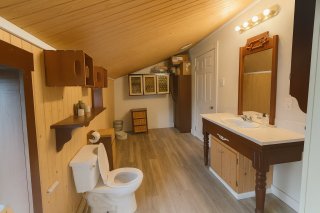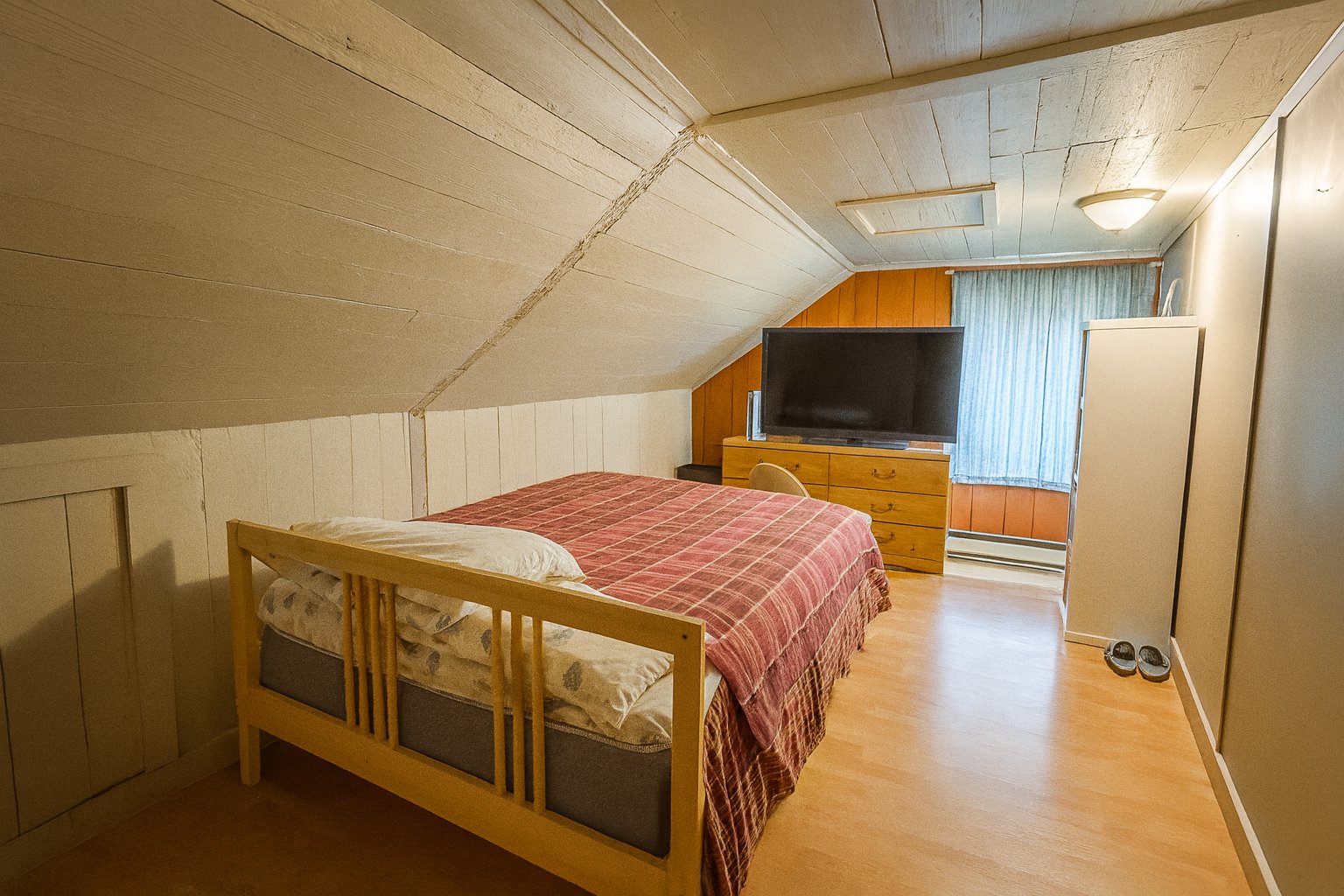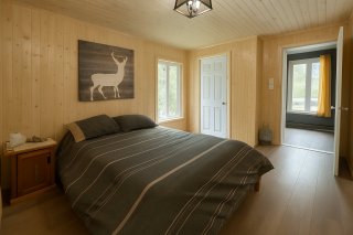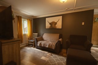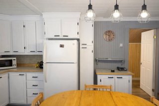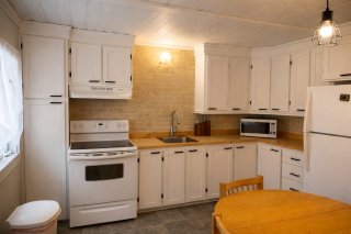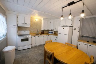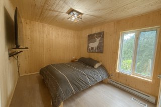 Inclus : Pôles, rideaux, poêle, frigidaire, laveuse, sécheuse, sofa, table, les meubles dans les deux chambres en haut.